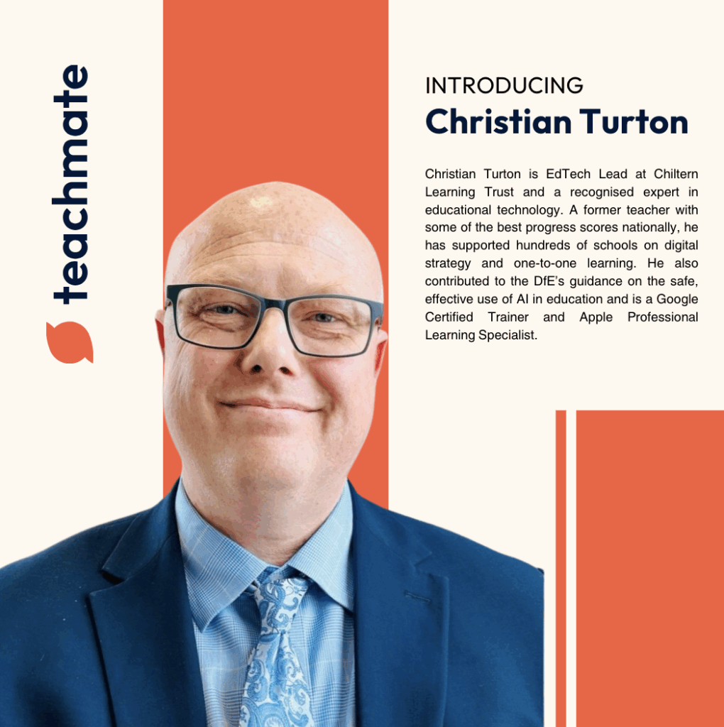 With Christian’s appointment, the Teachmate Advisory Group is now complete – uniting five respected voices from across the education landscape: Laura Knight, Claire Archibald, Daniel Emmerson, Alex More and Christian Turton. Together, they will help ensure Teachmate remains at the forefront of responsible innovation, putting teachers and students at the heart of everything we do.